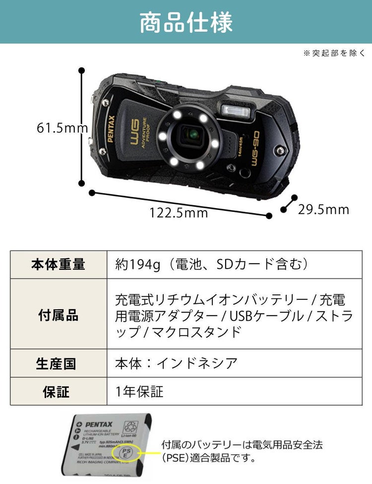 水深14m での水中撮影が可能なコンパクトデジタルカメラ ペンタックス デジタルカメラブラック WG-90 防水デジカメ4点セットプロテクトジャケット&SD64GB&クロス