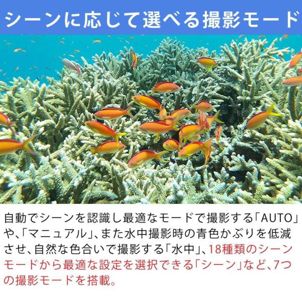 35ミリ判換算で約27?108mm相当の光学4倍ズームを搭載、さらにマクロ機能を使うことで最短5cmまで接写が可能。自動でシーンを判別し最適なモードで撮影する「AUTO」やISO感度を自分で選択できる「マニュアル」、水中で自然な色合いで撮影できる「水中」等、7つの撮影モードを搭載。またフルHDサイズでの動画撮影機能や連写撮影にも対応し様々なシーンで活躍。