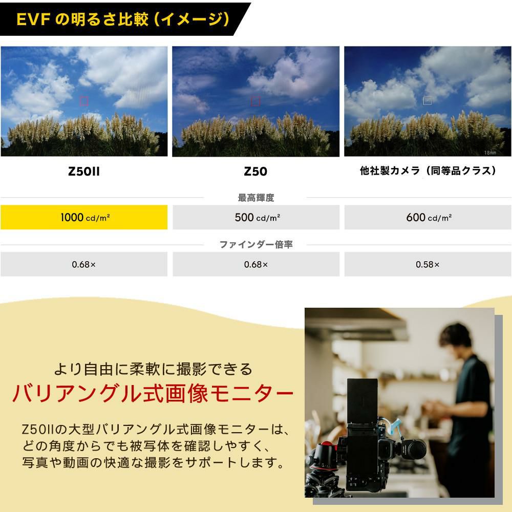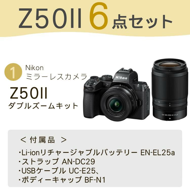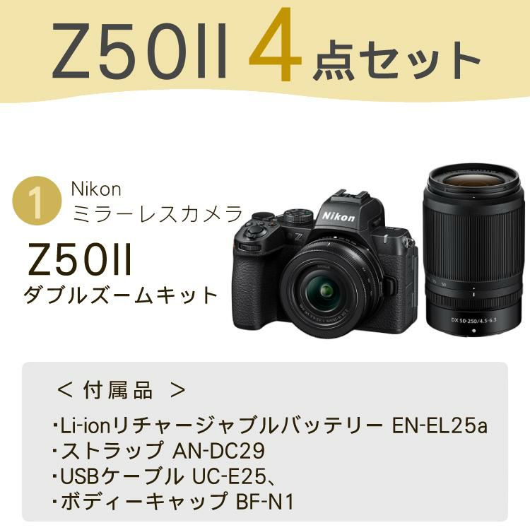 他の画像を見る APS-CサイズDXフォーマット、有効画素数2088万画素 ニコン ミラーレスカメラ Z50II ダブルズームキット Nikon(三脚・バッグ付6点セット) 販売価格 ¥ 182,500 税込 カートに入れる お気に入りに登録する (0件)