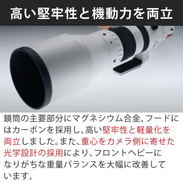 鏡筒の主要部分にマグネシウム合金、フードにはカーボンを採用し、高い堅牢性と軽量化を両立しました。また、重心をカメラ側に寄せた光学設計の採用により、フロントヘビーになりがちな重量バランスを大幅に改善しています。