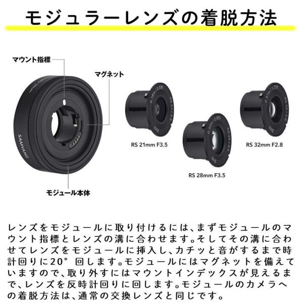 レンズをモジュールに取り付けるには、まずモジュールのマウント指標とレンズの溝に合わせます。そしてその溝に合わせてレンズをモジュールに挿入し、カチッと音がするまで時計回りに20°回します。モジュールにはマグネットを備えていますので、取り外すにはマウントインデックスが見えるまで、レンズを反時計回りに回します。モジュールのカメラへの着脱方法は、通常の交換レンズと同じです。