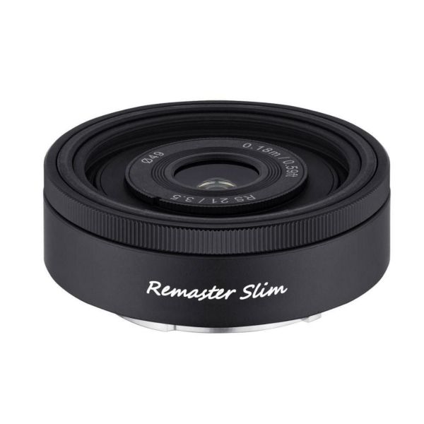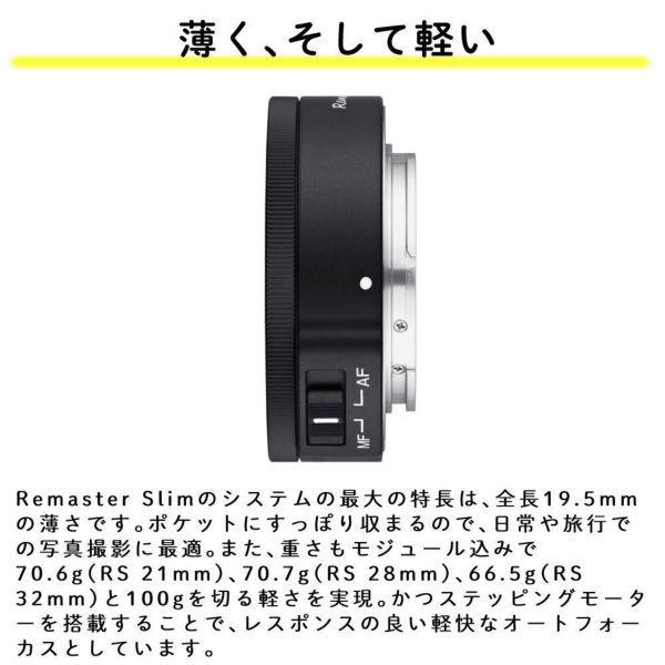 Remaster Slimのシステムの最大の特長は、全長19.5mmの薄さです。ポケットにすっぽり収まるので、日常や旅行での写真撮影に最適。また、重さもモジュール込みで70.6g(RS 21mm)、70.7g(RS 28mm)、66.5g(RS 32mm)と100gを切る軽さを実現。かつステッピングモーターを搭載することで、レスポンスの良い軽快なオートフォーカスとしています。
