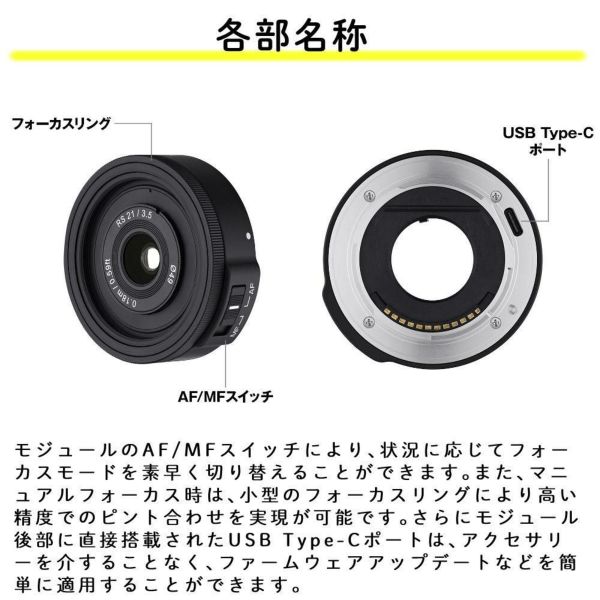 Remater SlimのモジュールのAF/MFスイッチにより、状況に応じてフォーカスモードを素早く切り替えることができます。また、マニュアルフォーカス時は、小型のフォーカスリングにより高い精度でのピント合わせを実現が可能です。さらにモジュール後部に直接搭載されたUSB Type-Cポートは、アクセサリーを介することなく、ファームウェアアップデートなどを簡単に適用することができ、レンズを常に最新のバージョンにしておくことができます。