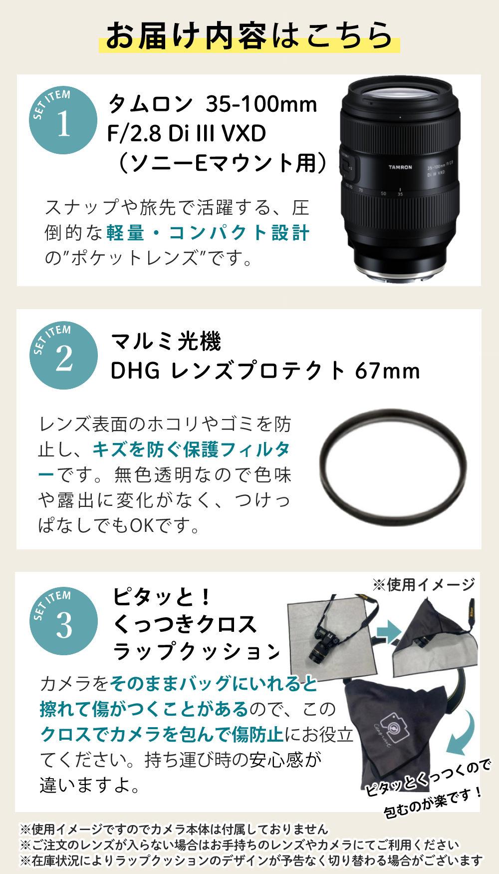 他の画像を見る タムロン 35-100mm F/2.8 Di III VXD ソニーEマウント用 (Model A078S)便利なオプション付き セット 販売価格 ¥ 146,080 税込 カートに入れる お気に入りに登録する (0件)