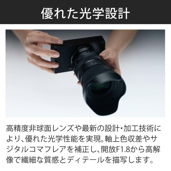 高精度非球面レンズの採用など、最新の設計・加工技術によって実現した光学設計により、優れた光学性能を達成しています。特に軸上色収差やサジタルコマフレアの補正に注力することで、開放F1.8から高い解像感を実現し、被写体の繊細な質感やディテールを描き出します。
