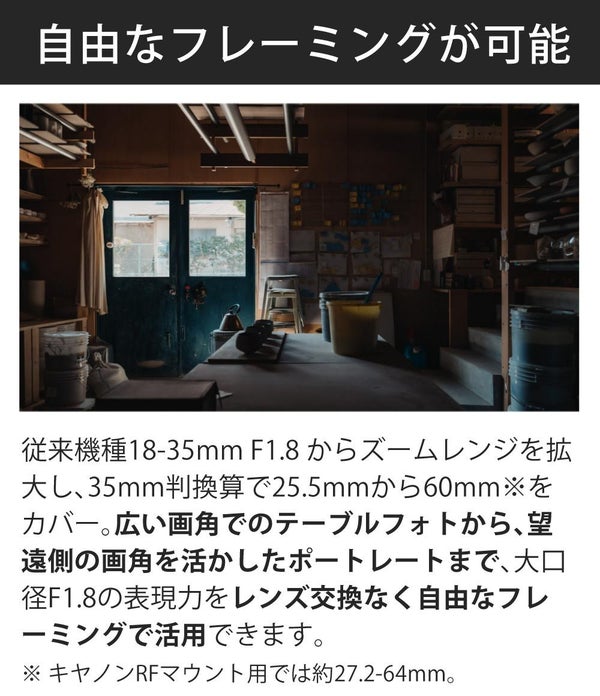 従来機種Sigma 18-35mm F1.8 DC HSM | Artからズームレンジを拡大し、35mm判換算で25.5mmから60mm※をカバー。広い画角でのテーブルフォトから、望遠側の画角を活かしたポートレートまで、大口径F1.8の表現力をレンズ交換なく自由なフレーミングで活用できます。
