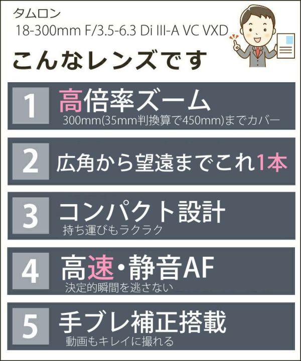 | 焦点距離 | 18-300mm (35mm判換算 28.8-480mm相当) |