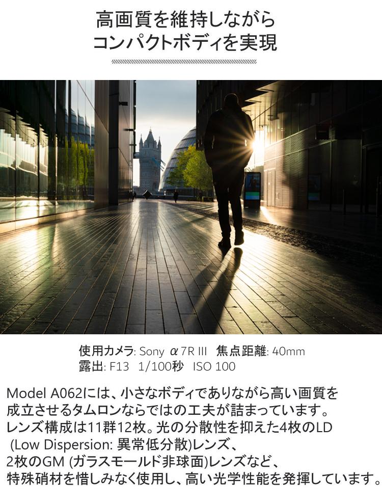 Model A062は、普段使いに最適な携帯性を徹底的に追求した、フルサイズミラーレス一眼カメラ対応ソニー Eマウント用の、タムロンが提案する新たな大口径標準ズームレンズです。