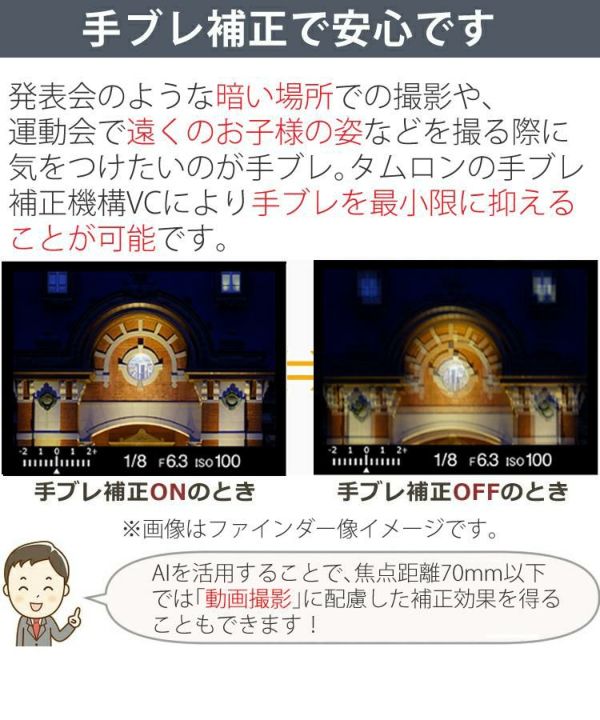 本レンズでは望遠域で発生しやすいブレを抑制するために、タムロン独自の手ブレ補正機構VCを搭載。薄暗い室内や夜景といった低照度下での手持ち撮影であってもその力を発揮し、画質の低下を効果的に軽減します。また、AI(人工知能)テクノロジーを活用することで、焦点距離70mm以下では動画撮影に配慮した補正効果を得ることもできます。