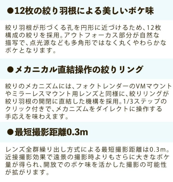 絞りのメカニズムには、フォクトレンダーのVMマウントやミラーレスマウント用レンズと同様に、絞りリングが絞り羽根の開閉に直結した機構を採用。1/3ステップのクリック付きで、メカニズムをダイレクトに操作する手応えを味わえます。