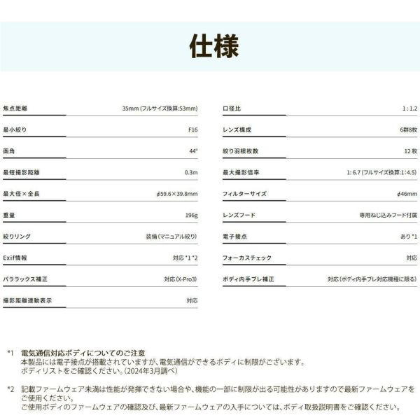 *3 記載ファームウエア未満は性能が発揮できない場合や、機能の一部に制限が出る可能性がありますので最新ファームウエアをご使用ください。 ご使用ボディのファームウエアの確認及び、最新ファームウエアの入手については、ボディ取扱説明書をご確認ください。