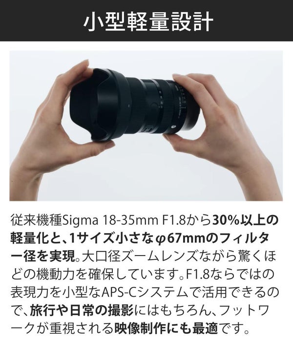 従来機種Sigma 18-35mm F1.8 DC HSM | Artから30%以上の軽量化と、1サイズ小さなφ67mmのフィルター径を実現。大口径ズームレンズながら驚くほどの機動力を確保しています。F1.8ならではの表現力を小型なAPS-Cシステムで活用できるので、旅行や日常の撮影にはもちろん、フットワークが重視される映像制作にも最適です。