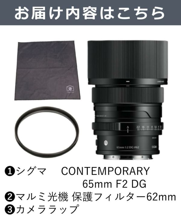 Sigma 65mm F2 DG DN Contemporary は、フルサイズ ミラーレスカメラ 対応の 単焦点レンズ です。高解像度 と 美しい ボケ味 を実現し、 ポートレート撮影 や スナップ撮影 に最適。金属製ボディ の 洗練された デザイン と 優れた 耐候性 で、どんなシーンでも 活躍します。