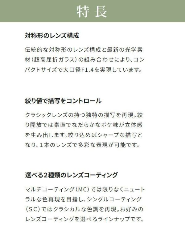 伝統的な対称形のレンズ構成と最新の光学素材(超高屈折ガラス)の組み合わせにより、コンパクトサイズで大口径F1.4を実現しています。