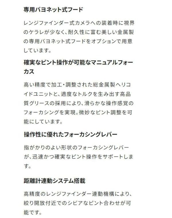 高精度のレンジファインダー連動機構により、絞り開放付近でのシビアなピント合わせが可能です。