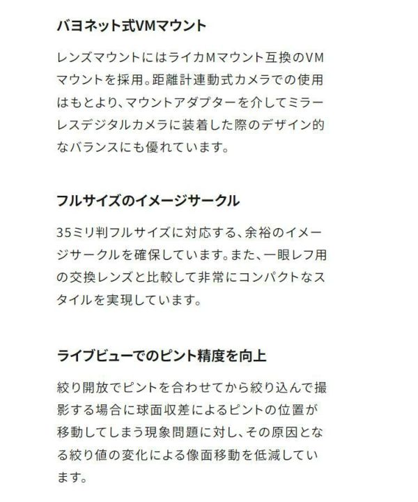 レンズマウントにはライカMマウント互換のVMマウントを採用。距離計連動式カメラでの使用はもとより、マウントアダプターを介してミラーレスデジタルカメラに装着した際のデザイン的なバランスにも優れています。