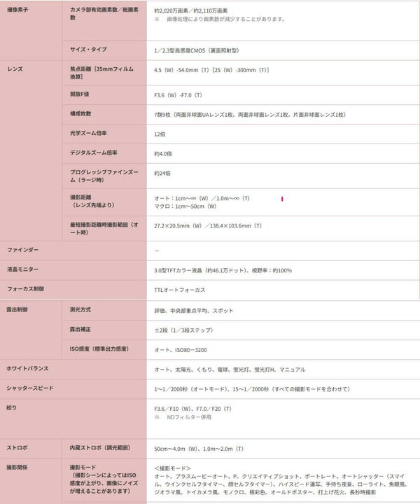 レンズ(焦点距離 / 35mm換算) 4.5(W)-54.0mm(T)[25(W)-300mm(T)相当]