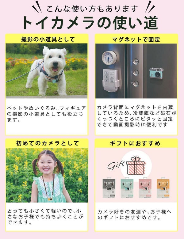 クラシックカメラをぎゅっと小さくしたようなかわいいデザインのトイカメラ。指でつまめるほど小さくて軽量です。