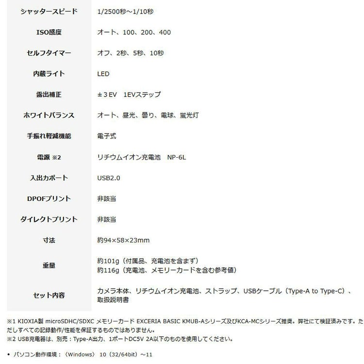 セット内容 カメラ本体、リチウムイオン充電池、ストラップ、USBケーブル(Type-A to Type-C)、取扱説明書