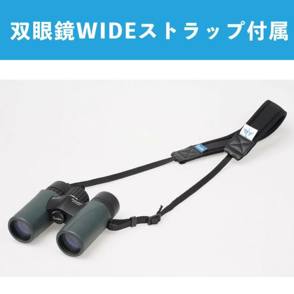 厚手生地で身体への負担を軽減し、長時間の観測を快適にサポートするKenko 双眼鏡用WIDEストラップが標準採用されております。パッド部分の素材には衝撃を吸収する厚手、軽量のネオプレーンを使用していますので負担のかかる首、肩の疲れを抑えます。