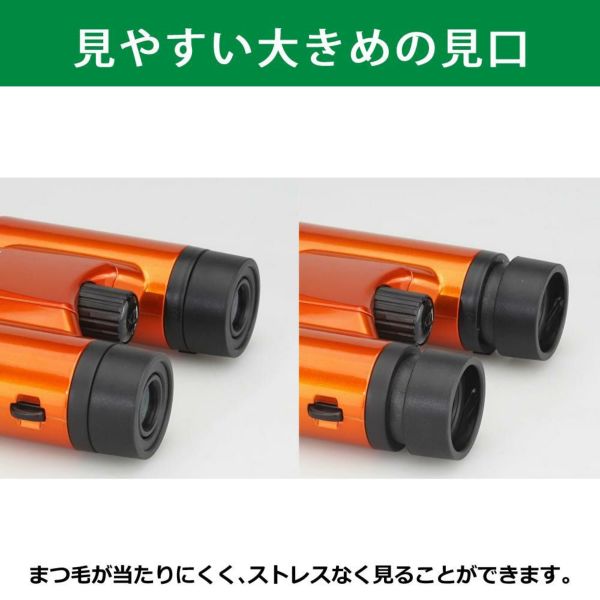 また、眼幅は33~72.7mmと広い調整幅で設計。顔の小さな女性やお子様でもしっかり調整が可能。 さらに大き目の見口設計で、まつ毛の長い方でもストレスなく見ることができます。
