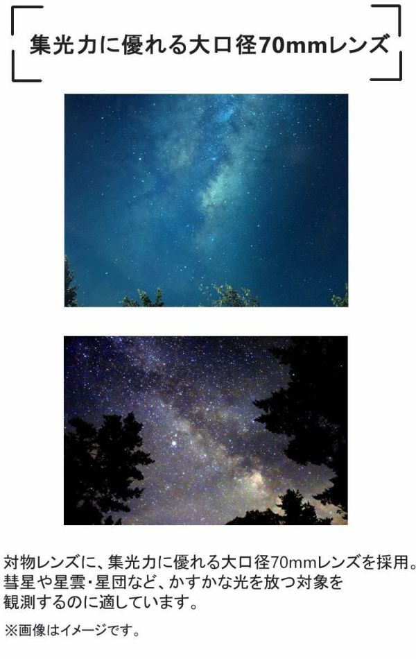 製品特長 ・対物レンズに、集光力に優れる大口径70mmレンズを採用。彗星や星雲・星団など、かすかな光を放つ対象を観測するのに適しています。