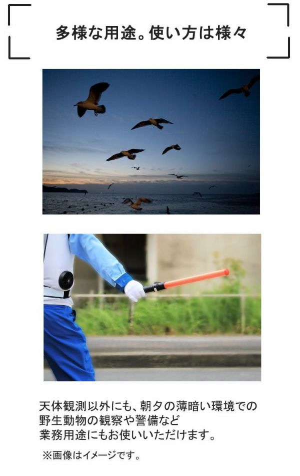 ・天体観測以外にも、朝夕の薄暗い環境での野生動物の観察や警備などの業務用途にもお使いいただけます。