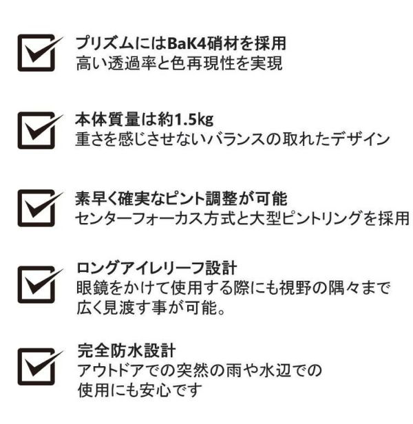・プリズムにはBaK4硝材を採用。多層膜コーティングを全てのレンズ面に施したフルマルチコートと相まって、高い透過率と色再現性を実現しています。