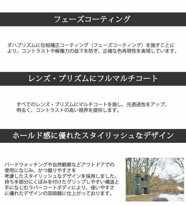 持ち手部分にくぼみを付けたグリップしやすい構造と手になじむラバーコートボディにより、使いやすさに優れたデザインの双眼鏡に仕上がっております。