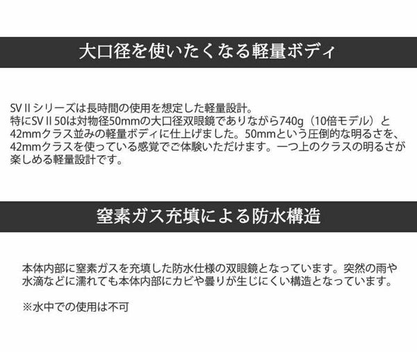 SV?シリーズは長時間の使用を想定した軽量設計。特にSV?50は対物径50mmの大口径双眼鏡でありながら740g(10倍モデル)と42mmクラス並みの軽量ボディに仕上げました。