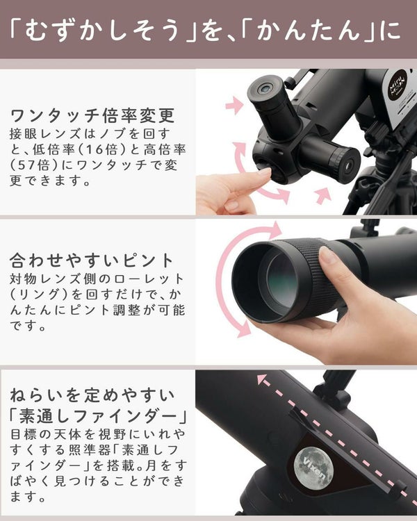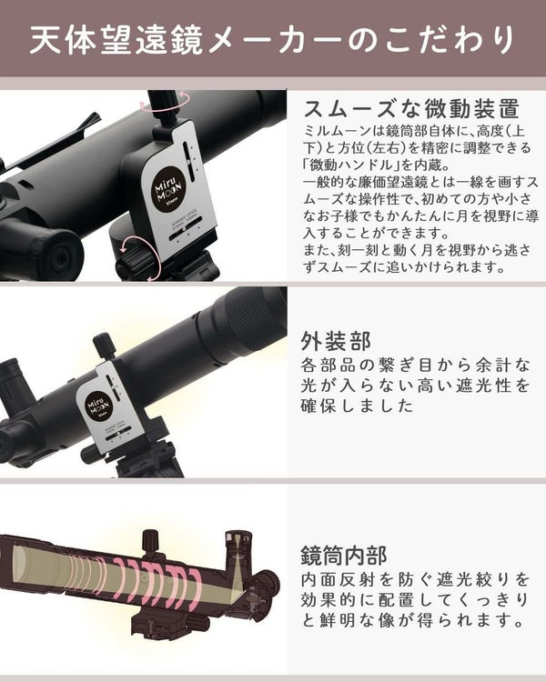 コンセプトは「手軽に月を楽しむ」こと。玩具のような手軽さですが、設計・製造は本格的な望遠鏡メーカー。天体観察に親しんでもらうための、確かなこだわりを詰め込みました。