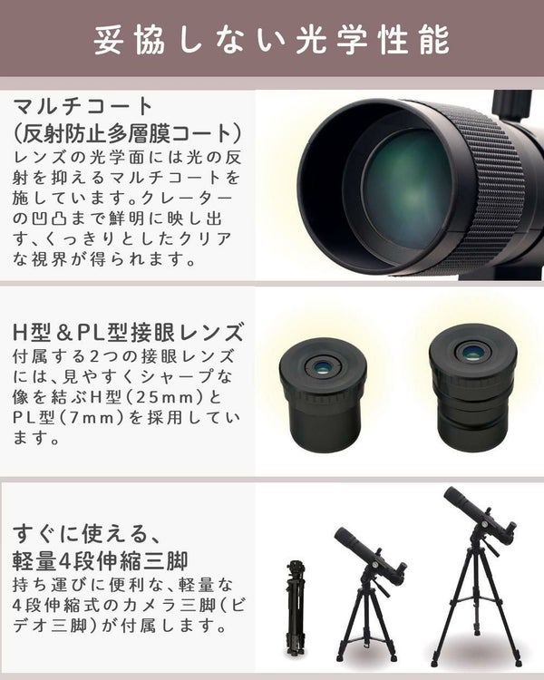 | 形式 | 屈折式望遠鏡(アクロマート・マルチコート) |