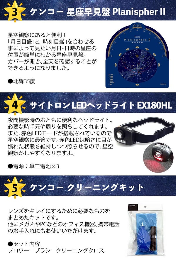 【付属品】三脚、太陽観測用アクセサリー(太陽フィルター・シェード・太陽ポインター)、キャリングケース