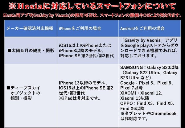 ・太陽&月の観測・撮影:「Gravity by Vaonis」アプリをGoogle Playストアからダウンロードできる機種であれば、対応しています。