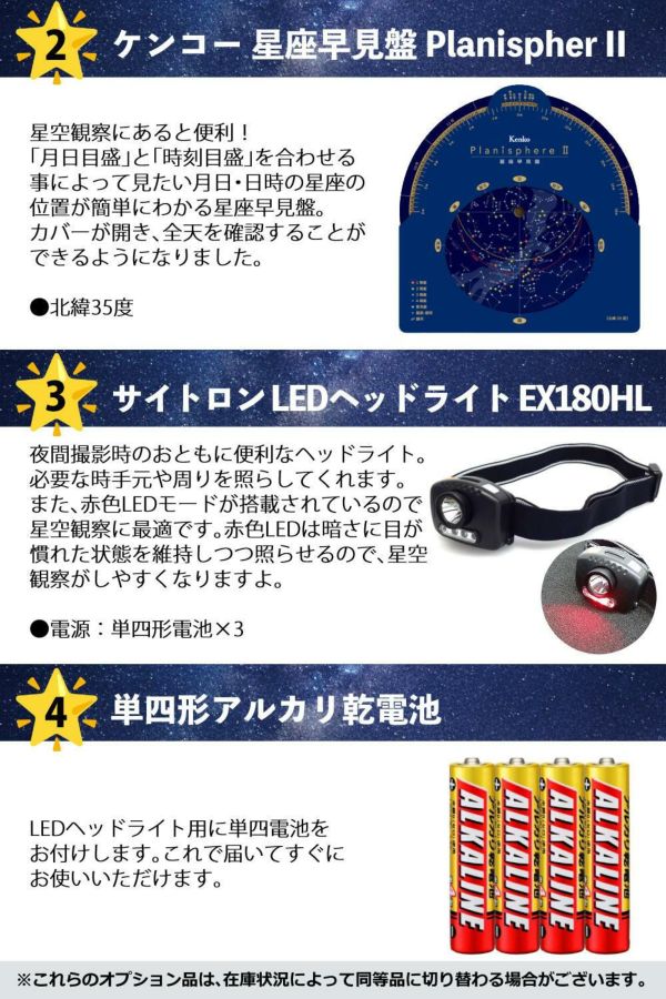 付属品 | アイピース 10mm(54倍)、23mm(23倍)、天頂ミラー、取扱説明書、星天観望(ガイドブック) |