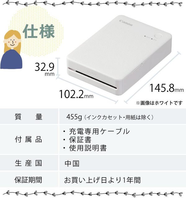 ●SELPHY QX20はコンパクト設計。重さ約455g※、本体サイズは約145.8(縦)×102.2(横)×32.9(高さ)mmです。バッテリー内蔵でワイヤレスのため、これ1つで場所を選ばず、持ち運びもでき、どこでも気軽にプリントができます。