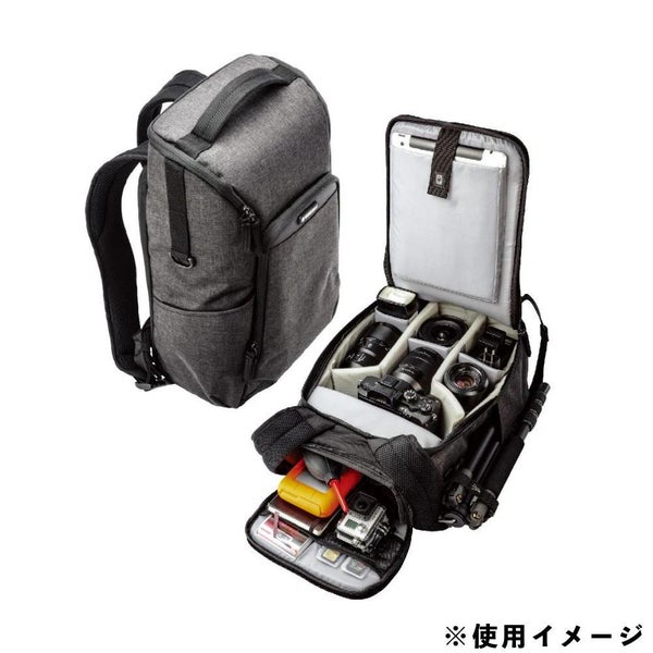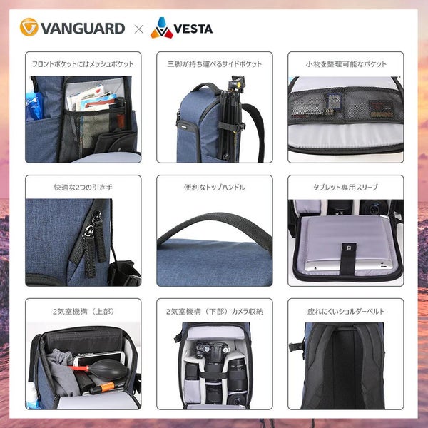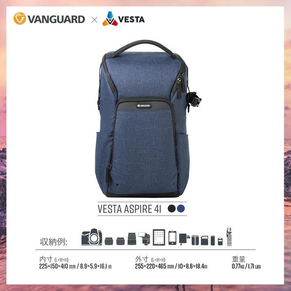 VESTA ASPIRE 41は、レンズが取り付けられたDSLRやCSC、3~4個の追加レンズ、フラッシュ、アクセサリー、9.7インチタブレットが収納可能。理想的なコンパクトサイズでスタイリッシュなリュックタイプのカメラバッグです。また、サイドポケットにVESTA COLLECTIONのVESTA TT1テーブル三脚を収納することもできます。
