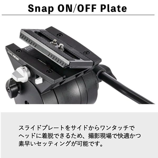 スライドプレートをサイドからワンタッチでヘッドに着脱できるため、撮影現場で快適かつ素早いセッティングが可能です。
