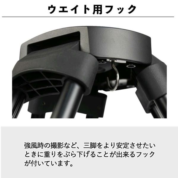 強風時の撮影など、三脚をより安定させたいときに重りをぶら下げることが出来るフックが付いています。