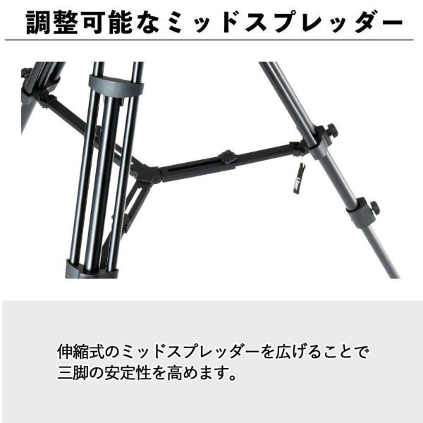 伸縮式のミッドスプレッダーを広げることで三脚の安定性を高めます。