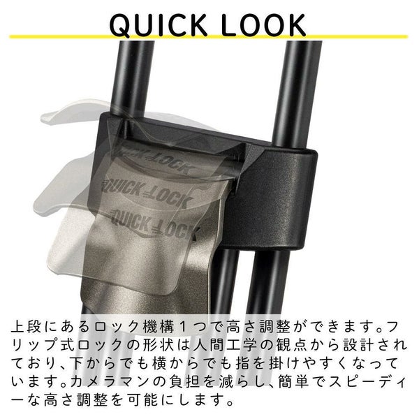 上段にあるロック機構1つで高さ調整ができます。フリップ式ロックの形状は人間工学の観点から設計されており、下からでも横からでも指を掛けやすくなっています。カメラマンの負担を減らし、簡単でスピーディーな高さ調整を可能にします。