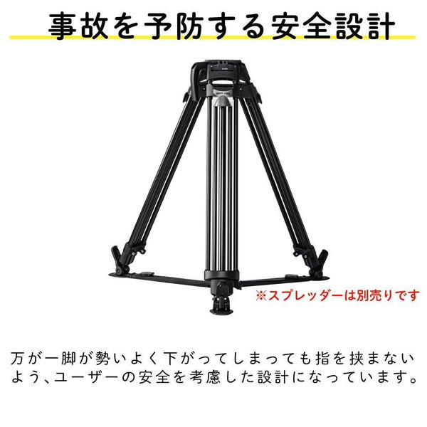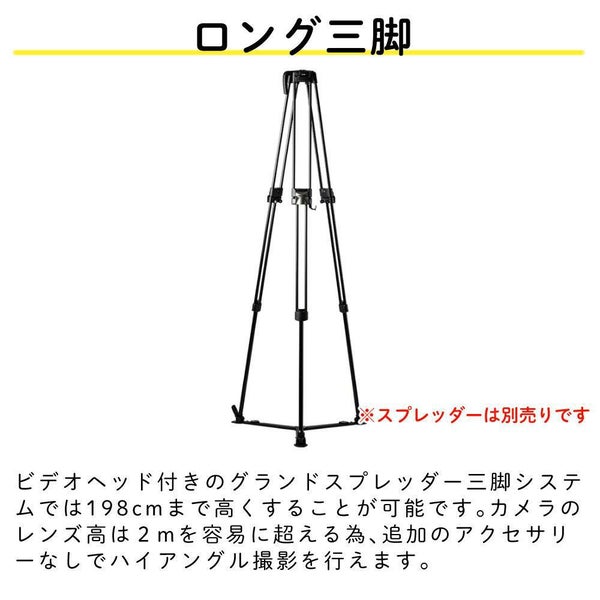 現行の75mm三脚「RT30B」に比べ最大高さが30cmも高くなっており、ビデオヘッド付きのグランドスプレッダー三脚システムでは198cmまで高くすることが可能です。カメラのレンズ高は2mを容易に超える為、追加のアクセサリーなしでハイアングル撮影を行えます。