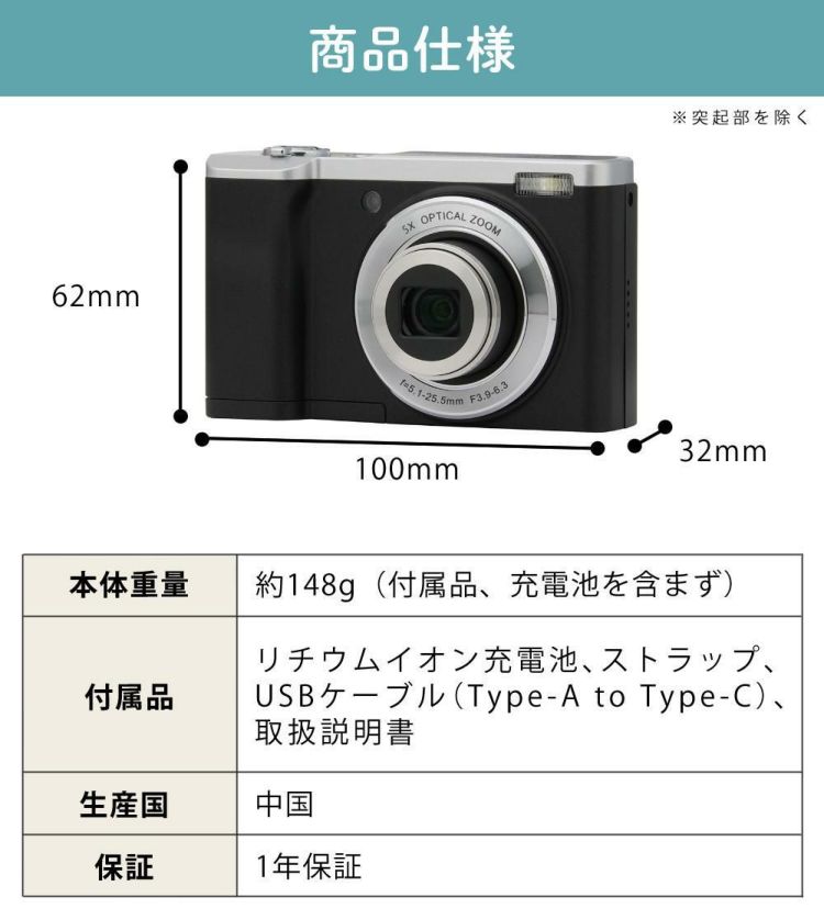 付属品 カメラ本体、リチウムイオン充電池、ストラップ、USBケーブル(Type-A to Type-C)、取扱説明書