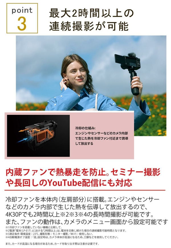 本体内に冷却ファンを搭載。エンジンやセンサーなどのカメラ内部で生じた熱を伝導して放出するので、