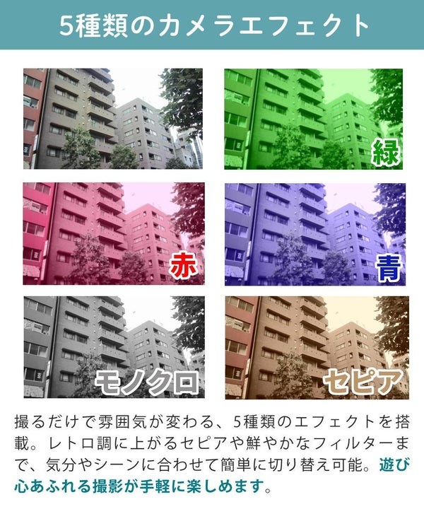 | カメラエフェクト | 赤 / 緑 / 青 / 紫 / モノクロ |