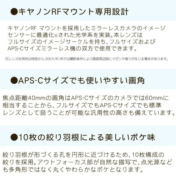 *1 レンズ光学的な特性から、EOS R、RP、R6では撮影条件により画面周辺部にマゼンタ被りが生じる場合があります。
