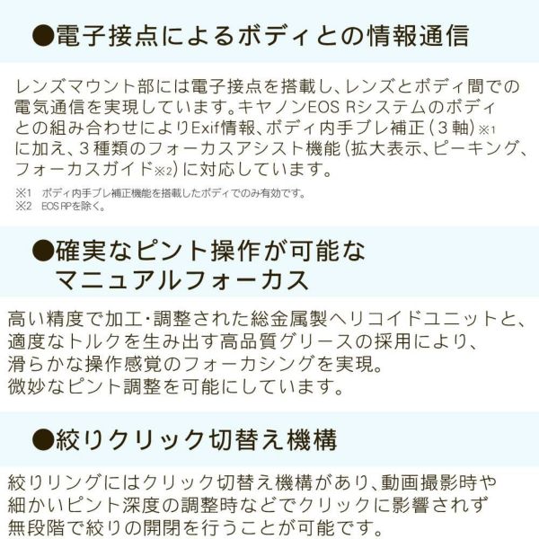 キヤノンEOS Rシステムのボディとの組み合わせによりExif情報、ボディ内手ブレ補正(3軸)*2に加え、