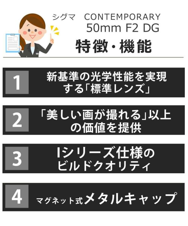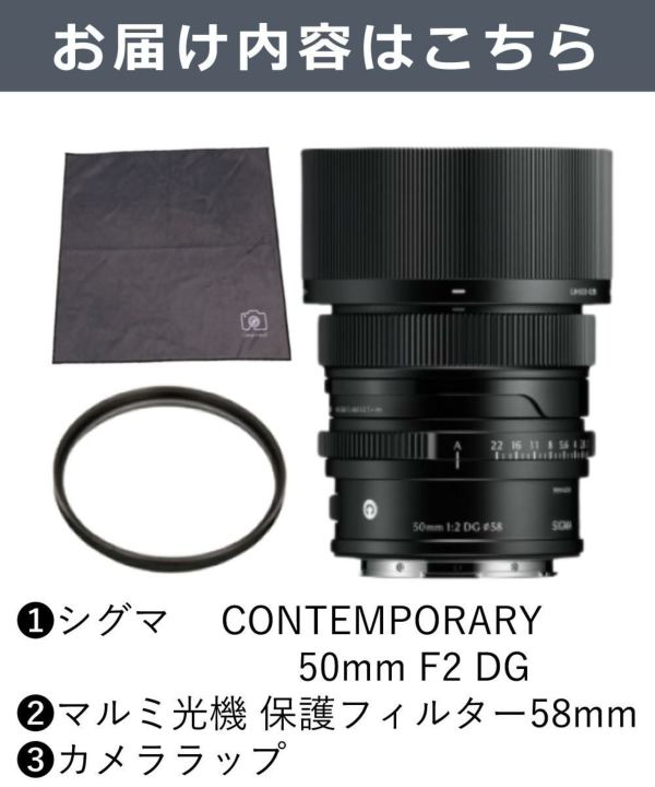 Sigma の 50mm F2 DG DN は Contemporary シリーズ の 単焦点レンズ 。 フルサイズ対応 で Eマウント と Lマウント に対応し、 高画質 かつ 美しいボケ を実現。 金属製ボディ の洗練されたデザインと 静音フォーカス で、 ポートレート や 風景撮影 に最適です。