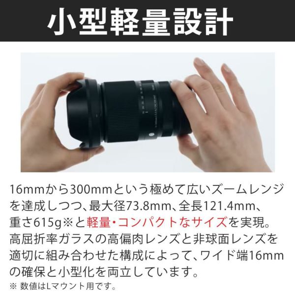 16mmから300mmという極めて広いズームレンジを達成しつつ、最大径73.8mm、全長121.4mm、重さ615g※と軽量・コンパクトなサイズを実現。高屈折率ガラスの高偏肉レンズと非球面レンズを適切に組み合わせた構成によって、ワイド端16mmの確保と小型化を両立しています。 ※ 数値はLマウント用です。