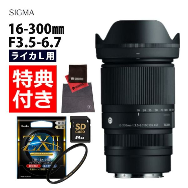 焦点距離70mm で 最大撮影倍率1:2 の マクロ撮影 ズームロックスイッチ フレア ゴースト抑制 フォーカスブリージング低減設計 動画撮影 に最適 高屈折率ガラス 非球面レンズ で 高画質 (レビューでプレゼント) ケンコー高品質フィルターセット シグマ 16-300mm F3.5-6.7 DC OS(C) ライカLマウント用
